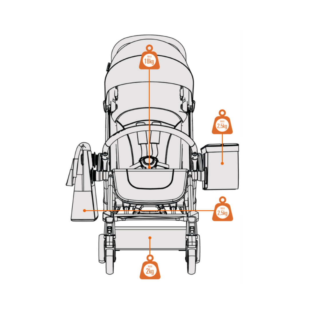 - Approvato fino a 25 Kg (18 Kg bimbo + 2 Kg sotto il cestello + 2.5Kg per lato con le apposite borse Bumprider)
